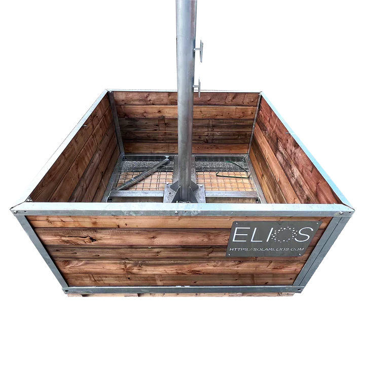 The Elios Basket 4 Panel Post is the ultimate foundation for the Elios Arbora P4 Pole Mount System, crafted after years of expertise in solar project installations. This robust and versatile basket comes with all necessary hardware, a durable base, and a strong structure. Simply add wooden planks (not included) to prepare the basket for filling with rocks, or enhance stability by using cement or cement blocks. Ideal for residential, commercial, and off-grid solar installations, the Elios Basket 4 ensures a secure and space-efficient solution for solar panel mounting.